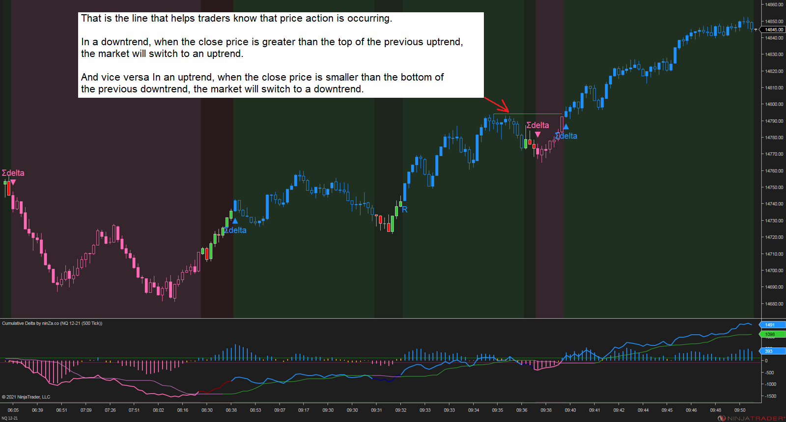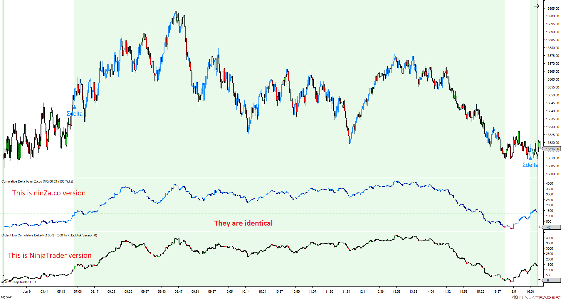 Our indicator just provides raw data of cumulative delta, which is identical to NinjaTrader 8’s Order Flow+ Cumulative Delta indicator. It’s the trader who has to analyze it. (see the attached pictures below)