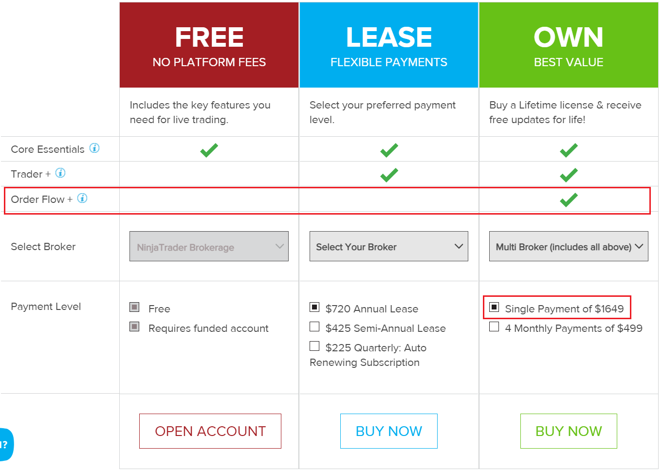 NinjaTrader 8’s Order Flow+ Cumulative Delta indicator has in the OWN version only. (see the attached pictures below or follow the link https://ninjatrader.com/BuyPlatform ) You can see the price of this version is $1649, but with our indicator, you only need to spend $396.